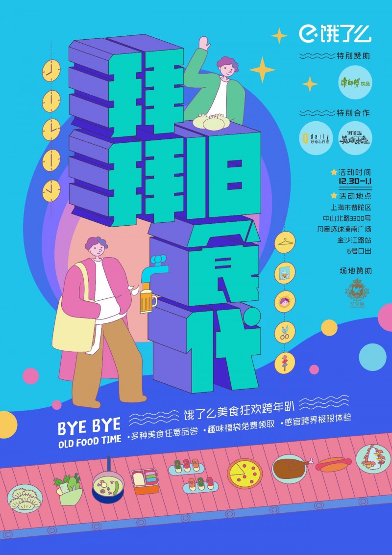 借势元旦,12月30日—1月1日跨界联合多个品牌在上海环球港南广场门口打造一场主题为“拜拜旧食代”的跨年快闪大趴,鼓励用户用美食回望2017、张望2018!