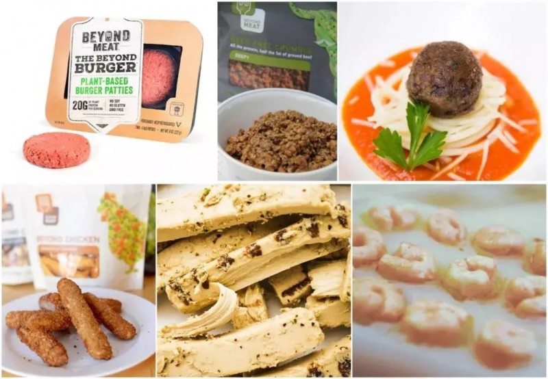 ▲已经面世的人造肉产品,上:牛肉汉堡肉饼、牛肉馅、牛肉丸子,下:香肠,鸡肉条,虾仁