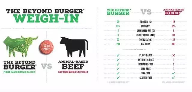 ▲ BeyondMeat跟传统牛肉对比,营养成份相差无几,同时具备无抗生素、激素等优势