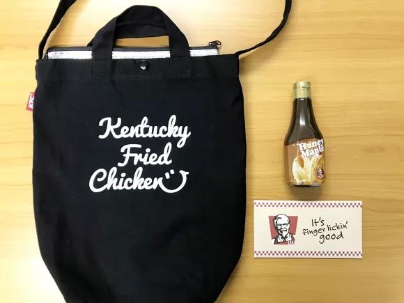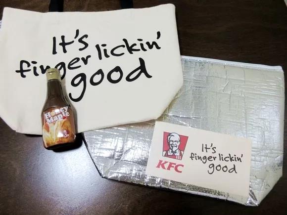 跟麦当劳一样,肯德基福袋的包装也是一个帆布购物袋,售价 2500 日元,不过里面就只有一瓶肯德基蜂蜜糖酱、一个保温密封袋和肯德基的兑换券。
