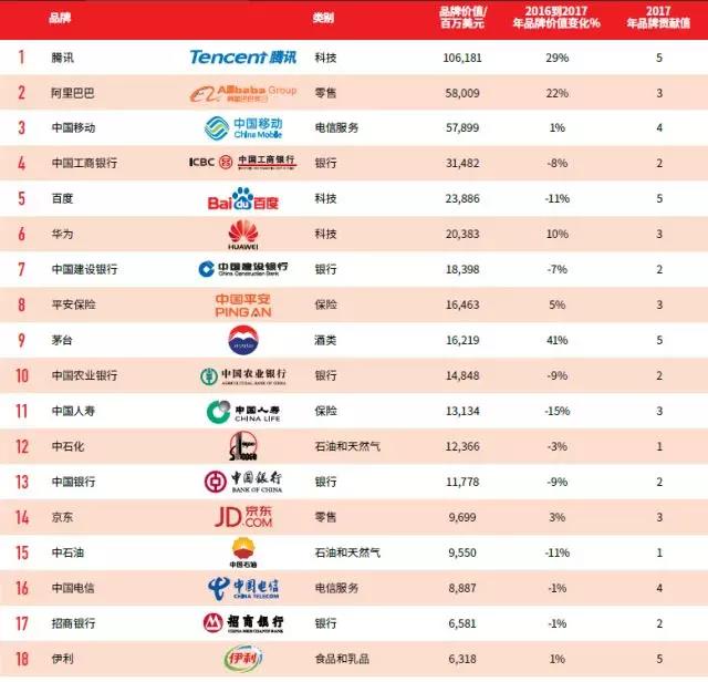2017年度BrandZ™中国最具价值品牌100强榜单