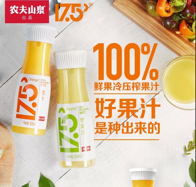 从地头到店头,全程管理。黄金糖酸比,冷榨高科技,原生果营养。农夫山泉推出17.5°NFC果汁曾自认为是中国果汁饮料的新高度!