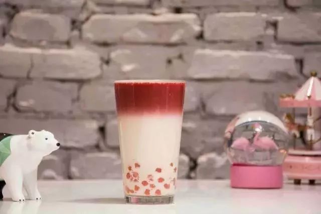 红丝绒粉10g,米浆粉20g,樱花珍珠2勺,热水150ml,牛奶200ml,果糖10cc。