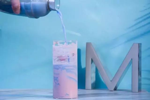红丝绒蛋糕酱20g,蓝丝绒粉10cc,热水100cc,牛奶200cc,优格乳20cc,果糖20cc,冰块150g。