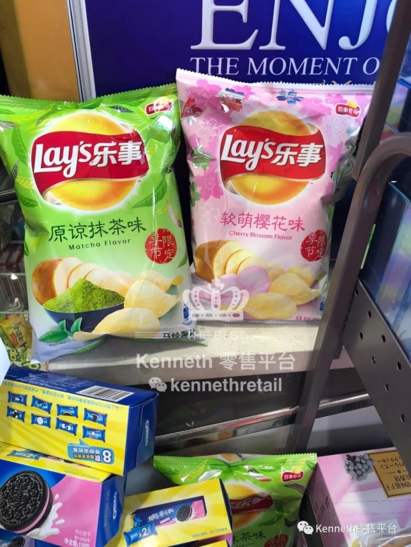 下面是Kenneth在上海罗森便利店看到的情况,在特别的陈列货架发售(不是正常货架,¥10两包)。其实这次上市是两【季节限定】的口味,可能更多人会喜欢这款小清新的【软萌樱花味】,但名字来说,原谅抹茶味就更有网络疯传的基因。
