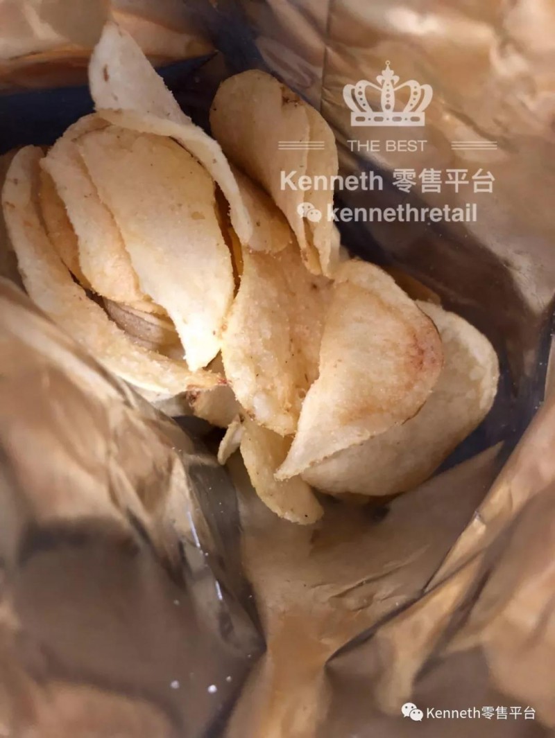 很多人都期待是否里面会有不一样的颜色,其实薯片没有变成粉色或者绿色,也就是比较正常的。下面是樱花口味的情况。