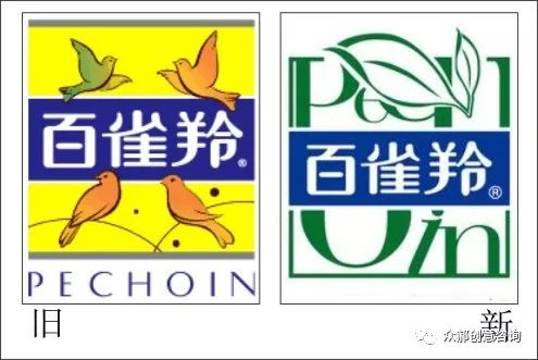 百雀羚转型第一步做的就是logo上的与时俱进。从原来的四只雀加英文的构成进行优化,绿色元素也更丰富,从而更加诠释品牌文化特征。