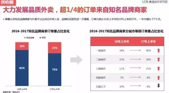 根据报告可知,目前外卖呈现出品质外卖快速发展趋势,超 4分之一的订单来自知名品牌商家。