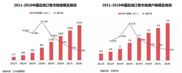 在线外卖市场在经历前期野蛮增长后增速放缓。中国在线外卖市场2017年市场规模预计达到2046亿元,增长率23%,2018年将达2414亿元。在线订餐用户规模将达到3亿人,同比增长18%,规模和用户的增长率,都有所下降,但仍高于餐饮大盘增速。