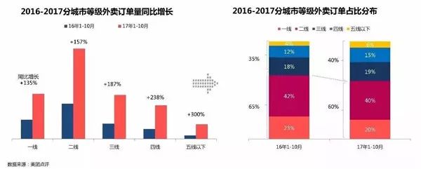 发展研究报告指出,外卖未来发展空间——需要在供给、需求、配送三端发力。其中供给侧看,三四线城市外卖订单同比增长远高于一二线城市,订单占比高达40%,同步增加5个点。