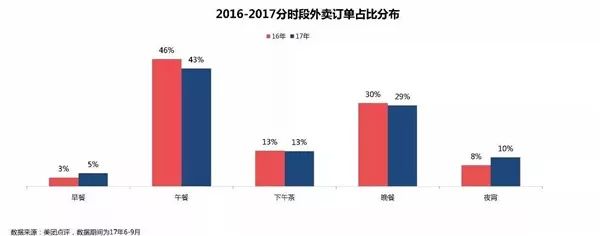 根据发展报告,我们可知2017年非正餐时段外卖订单占比进一步提高,午餐和晚餐正餐时间段订单占比由76%压缩至72%,下降4个点,其中早餐占比5%,上升2个点,夜宵占比10%,上升2个点。随着外卖习惯的养成,未来非正餐时段将爆发更好的商机。