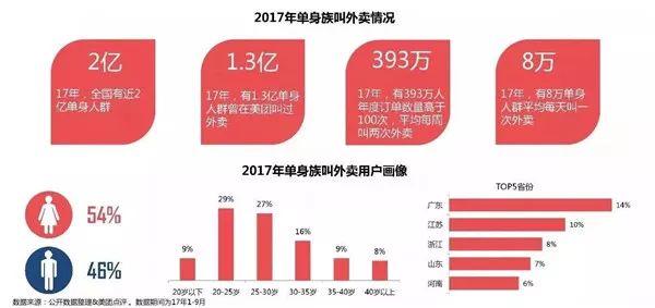 根据发展报告可知,2017年,全国有近2亿单身人群,1.3亿在美团叫过外卖,393万人年度订单数高于100次,平均每周叫2次外卖。其中有8万人,每天叫一次外卖。外卖一人食消费成为主流。