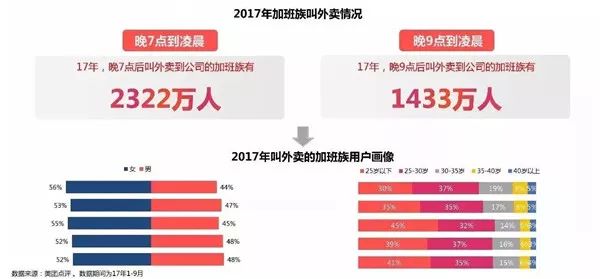 启示:针对超过数千万的工作加班党,以白领为主要顾客源的商户,可以为加班族做出更加贴心的营销和餐品,更能获得加班族的好感。根据加班场景,商家还可以配合营销活动、文案推出一些多人享用套餐,还可扩大销售量。