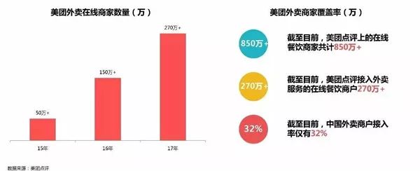 根据报告数据,虽然目前美团外卖的在线商家已超270万,但是在整体的餐饮商家数量中占比只有 32%。传统餐饮商家需要积极转型,拥抱互联网 +外卖,充分利用互联网外卖的平台流量和资源实现线上+线下协调发展。
