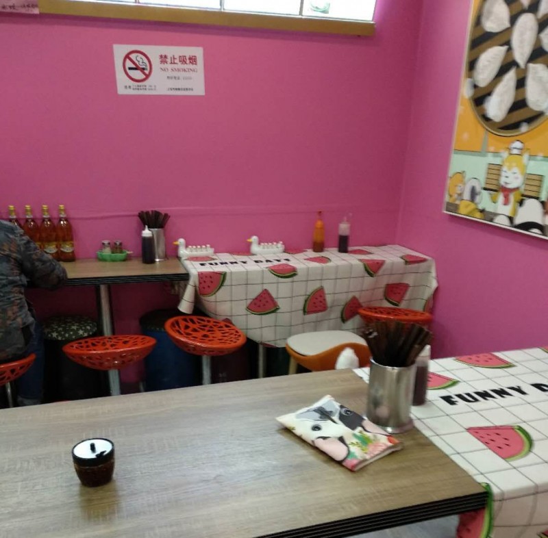 这是改造效果最好的一家门店,也是最被媒体热捧的。不但店内外粉刷一新,而且从桌布到餐具,到处是可爱的小动物形象,连椅子都换成了带着一个毛绒尾巴的萌系椅子。
