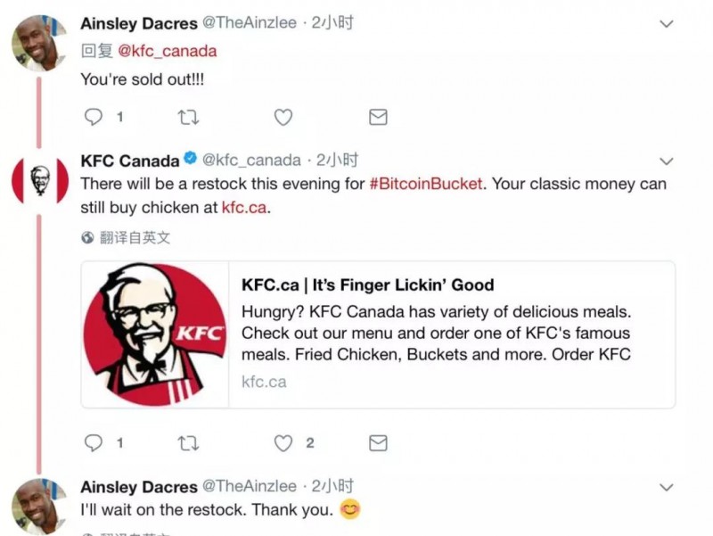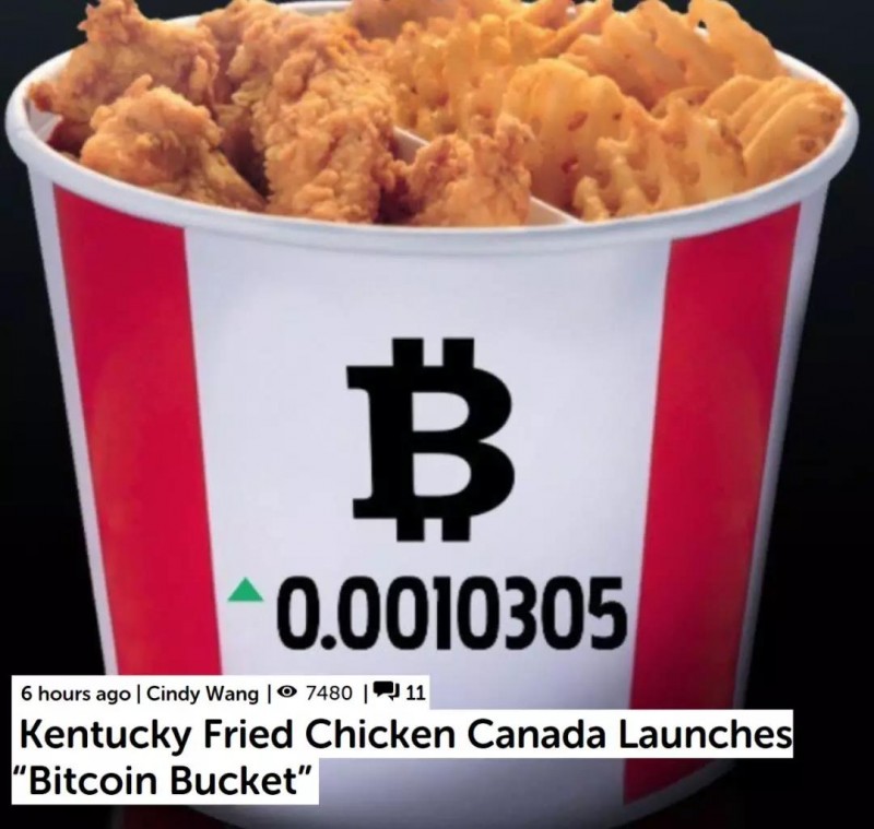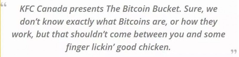 肯德基加拿大分公司在其官网上写道“看,我们带来了比特币桶。当然,我们不知道何为比特币,也不知道怎么用比特币,但是顾客知道肯德基啊!”