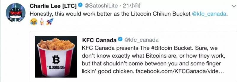 莱特币创始人Charlie Lee转发了该文,评论说莱特币比比特币更适合用来买炸鸡桶。