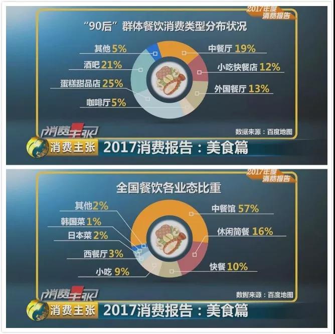 近日,中国烹饪协会发布的《 2017 年度美食消费报告》显示,“90 后”群体的餐饮消费比重,中餐厅占比仅有 19%(总体人群中餐厅占比 57%)。酒吧占比 21%,蛋糕甜品占比 25%,其余的品类占比 35%。