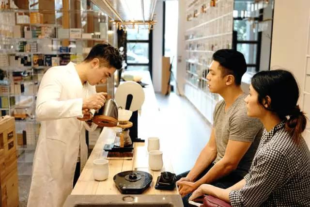 从空间设计上,药店属性被模糊化,展架上的药瓶看上去更像是艺术品,配合盆栽、木质家具。给人新奇之感。大厅中间的木质吧台,可以喝着一杯咖啡或其它饮品,休息一下,或者与店里的药师聊聊健康方面的话题。