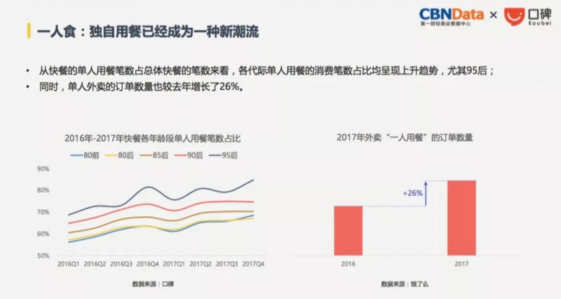 比如越来越流行的“一人食”等独立乐活主义,在近些年就呈现出快速增长的趋势。数据显示,2017 年独自点外卖用餐的订单数比 2016 年增长了 26%。