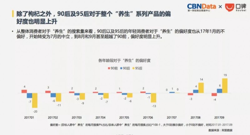保温杯泡枸杞事件的爆红,也让养生成为了新一代年轻人的消费新追求。虽然如今头发秃了、走入“中年危机”的才是第一批 90 后,但 95 后们却也早早走上了养生之路,蜂蜜、枸杞、乳清蛋白、养生茶、酵素等产品成为了他们的购物首选。