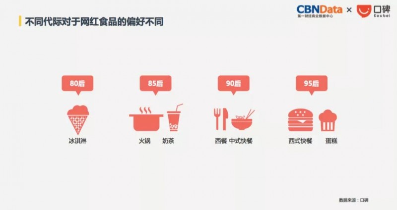 而对不同的消费群体来说,他们偏好的网红产品也是不尽相同的,比如 80 后偏向于冰淇淋,85 后喜欢火锅和奶茶,90 后偏爱西餐和中式快餐,而 95 后则更喜欢西餐类的产品。