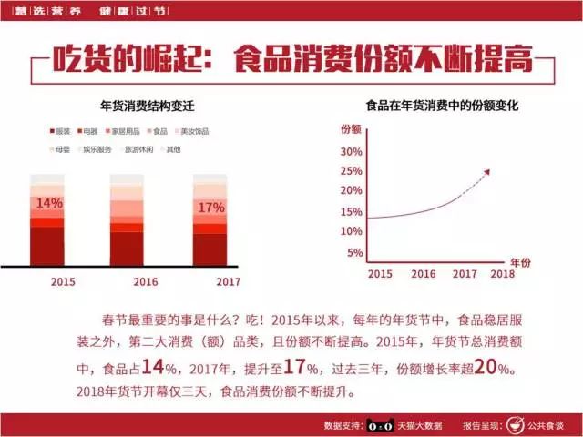 1月24日,在中国疾控中心营养与健康所等6机构发布的“慧选营养,健康过节”——2018春节食品消费建议活动上,天猫公布了其近年来年货节的食品消费大数据,这些数据不仅反映了公众的食物消费习惯,其实也能透露出食品行业的一些变迁。
