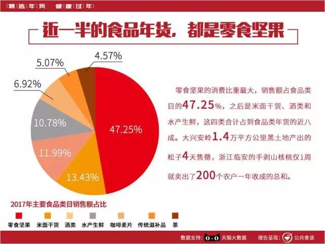虽然不排除“买零食坚果的人更喜欢去天猫买”这个因素,但零食坚果类在年货中占比最大是可以理解的,过年的主色调就是“祥和、休闲”,待客自用需要糖果花生开心果之类。