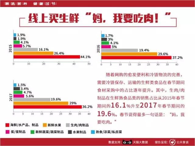 生鲜销售数据的变化,更能反映这个生鲜电商这个行业的进步。比如生肉/肉制品从2015年占比16.1%升至2017年的19.6%,实际上并不是说这两年来老百姓更喜欢吃肉了,更可能是这两年来,在天猫生鲜上买肉“更划算了”或者“更愿意了”,
