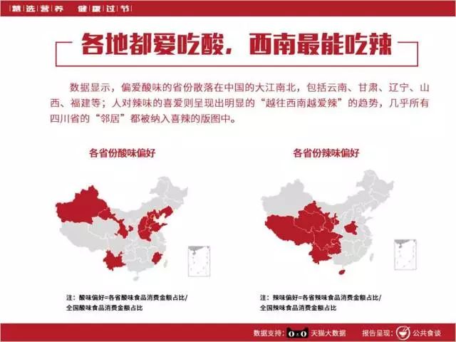 甜咸酸辣的分布,大体上符合大家的印象,但也不符合大家认知的地方,比如江西湖北安徽三省,总体来说并不偏好吃甜,而公认喜爱吃辣的两个省江西、湖南却没有上榜,不知道是统计偏差,还是年轻一代的消费习惯已经在悄悄改变。