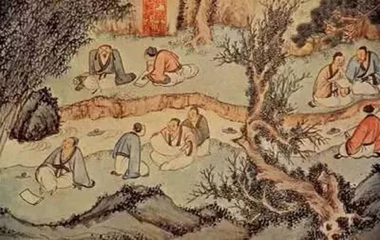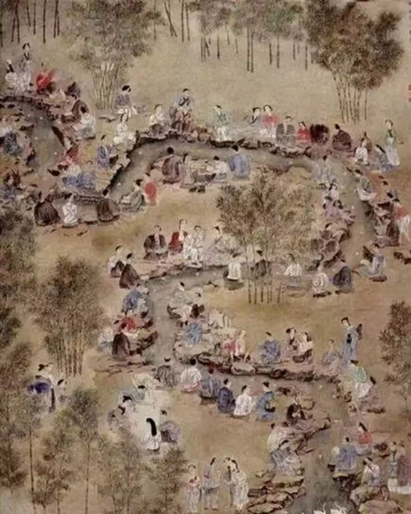 这描写的是王羲之和四十一位友人在兰亭聚会时的盛况。天朗气清的春日,一帮友人在大自然间游山玩水,兴起之时,坐在溪水边的草地上交谈、喝酒、作诗……