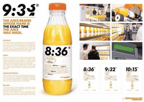 对啦,法国的一家连锁超市Intermarché 就是这样做的:为了体现果汁新鲜程度,超市直接果汁的榨出时间作为产品的名字,精确到分钟。