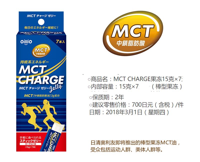 MCT油目前在日本市场热销,据了解,日本日清奥利友公司即将在3月推出便携型的果冻状新品,如上图所示,图片来源于网络报道。