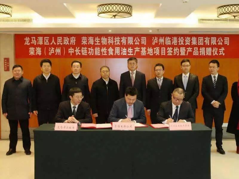 四川泸州龙马潭区政府、荣海生物科技有限公司、泸州临港投资集团公司签定“荣海(泸州)中长链功能性食用油生产基地项目”合作协议。根据协议,项目占地总面积约130亩,总投资约5.2亿元人民币,达产后年产值约18亿元,年缴纳税收约2.7亿元。