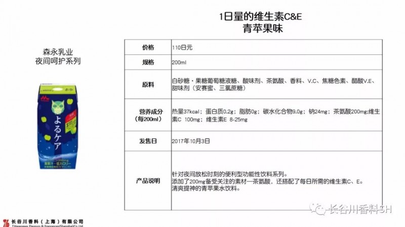 森永针对成年人推出的“有夜间放松”作用的即饮饮料。添加了200mg能让人镇静安神的茶氨酸、以及维生素C与维生素E。