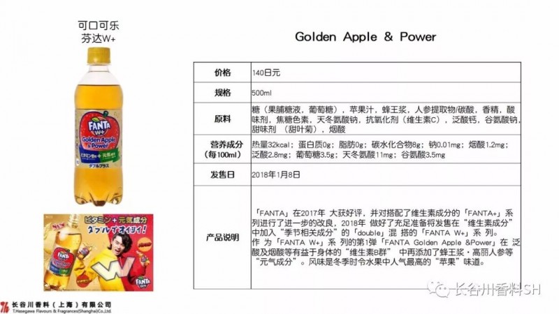 在原有添加了维生素成分的芬达系列进行升级,推出了新加入”季节性成分“的2种所需营养成分,打造了全新的系列“芬达W+”。作为该系列的第一弹产品,不仅加入了泛酸与烟酸等有益于身体的维生素B群,还特别加入了蜂王浆与高丽人参提取物,让人元气满满。风味则是选用了冬季最受欢迎的苹果风味。