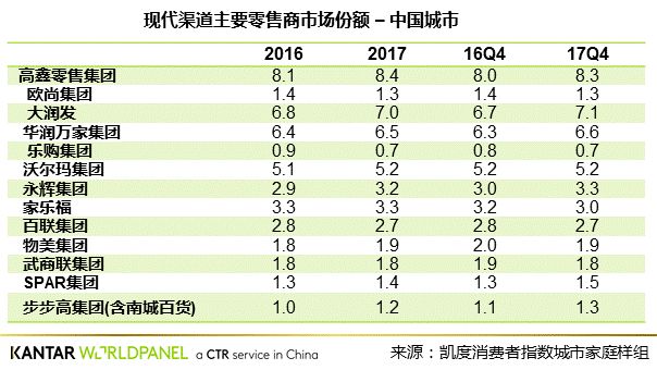 西区和北区表现突出,增幅分别达到6.0%和4.7%,推动了整体市场的增长。现代渠道(包括大卖场、超市和便利店)增幅为2.6%,而上一年仅增长1.6%。现代渠道中的主要零售商在2017年不断推出创新性的商业模式,通过O2O战略主动满足中国消费者在新零售时代不断变化的需求。