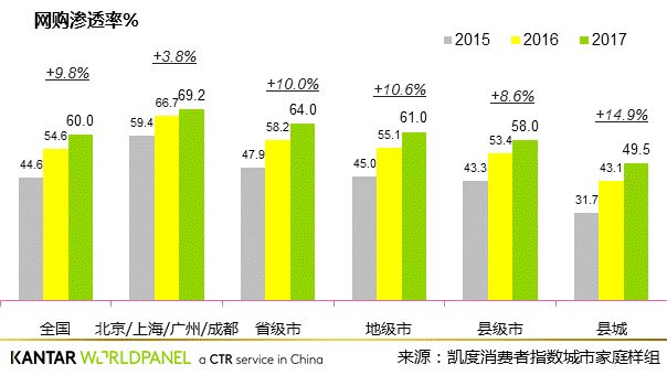 凯度消费者指数报告显示,过去一年快速消费品在电商渠道的销售额同比增长29%。2017年,有60%的中国城市家庭在线上购买了快速消费品,比上一年增长5.4个百分点。在北京,上海,广州和成都四重点城市,近70%的家庭在线上购买快速消费品。此外,购买频次也开始推动该渠道的增长。网购已经成为消费者购物的普遍方式,而通过移动端购买则推动了电商购物的碎片化。2017年,中国消费者在电商渠道的购买次数平均为7次。