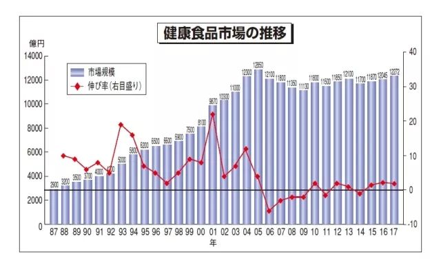 2017年日本健康食品市场规模,根据日本健康产业新闻的统计,比上一年度增长1.9%,达到1万2,272亿日元(约合人民币725亿元)。虽然没有达到顶峰之年2015年的1万2,850亿日元(约合人民币760亿元),但已经是有统计以来的第3高的年份。