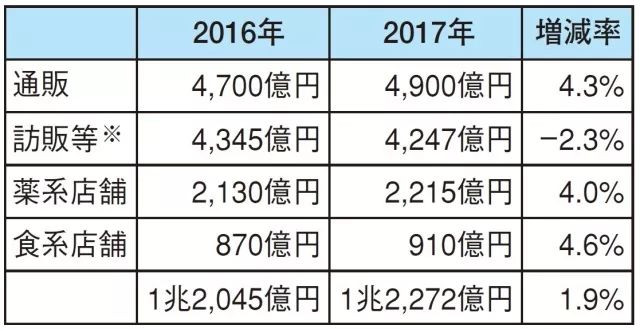 2017年唯一缩小的健康食品市场是「访问销售」。MLM(中国称直销)属于访问销售的范畴,日本安利等企业效益还不错,但是日本政府管制的一直在加强,基于特商法的规定,直销大型公司福蒂姿受到停止营业的行政处分给业界带来了很大的冲击。