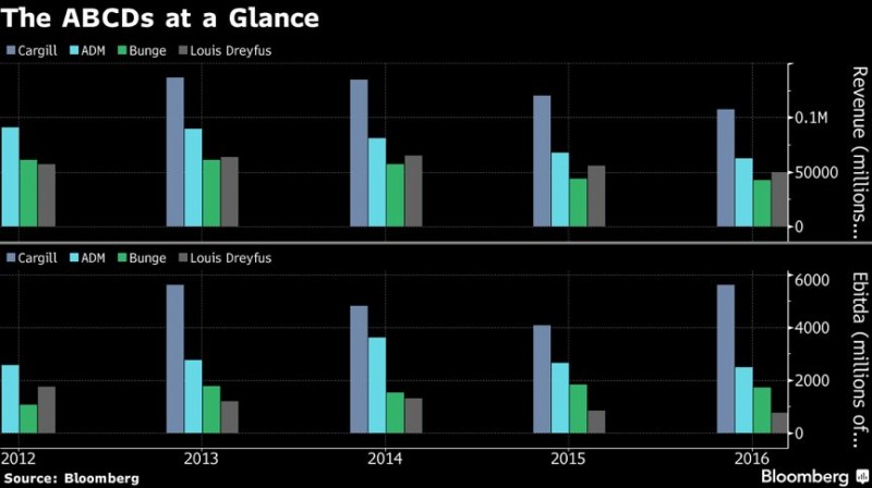 如果交易达成,由ABCD四大公司主导的全球粮食产业将经历最大的一次变革。近二十年来,这个行业中的中型企业不断被整合,巩固了顶尖公司的领先态势,比如嘉吉公司在1999年收购了Continental,ADM接管了Andre & Cie的大部分资产。