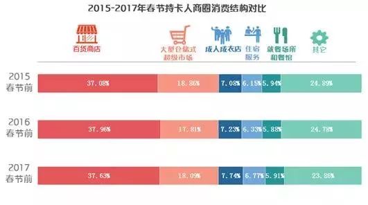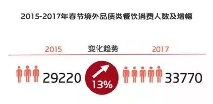 在出境游方面,境内居民在品质类餐饮商户的消费规模不断增长,与2015年春节相比,2017年春节期间该交易金额提升了19个百分点。