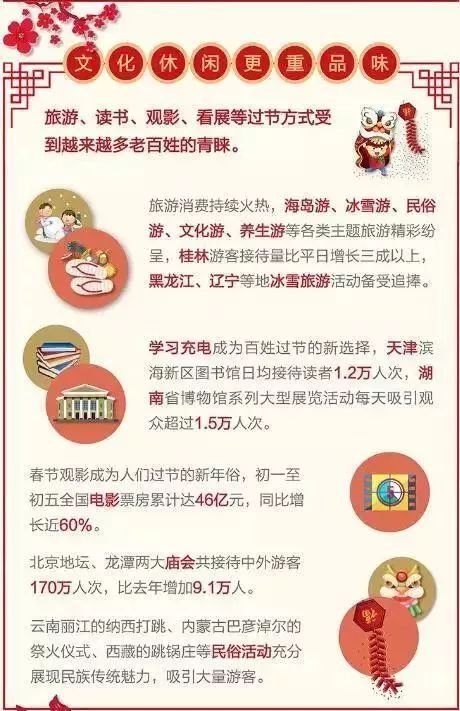 商务部公布了春节7天假期消费总体情况,从除夕到正月初六,全国零售和餐饮企业实现销售额约9260亿元,比去年春节黄金周增长10.2%。旅游花掉4750亿元,看电影5天花掉50亿元……品质消费成为今年春节消费市场的一大亮点。