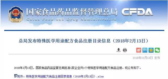 2月13日,食药监总局获准一家企业共一个特殊医学用途配方食品注册,获准产品为“杭州贝因美母婴营养品有限公司”旗下的“贝因美特殊医学用途婴儿配方食品无乳糖配方 (注册证号: 国食注字TY20180001) ”, 有效期至2023年2月12日。