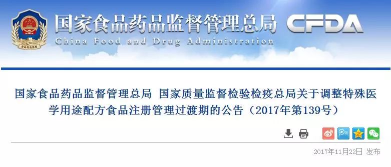 2016年7月1日,《特殊医学用途配方食品注册管理办法》正式实施,注册过渡期截止到2018年1月1日。然而就在第一批特殊食品审批通过的第二天,食药监总局又发出了《关于调整特殊医学用途配方食品注册管理过渡期的公告》(2017第139号),将过渡期延长至2019年1月1日。