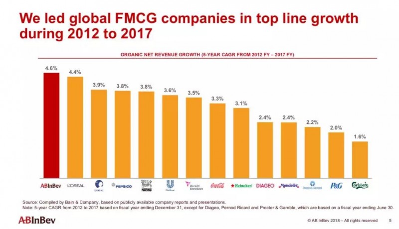 过去五年,百威英博营收的年复合增长率为4.6%,超越了众多快消品同行,包括欧莱雅,达能,百事,雀巢,联合利华等,更是把喜力和嘉士伯集团甩在了身后。