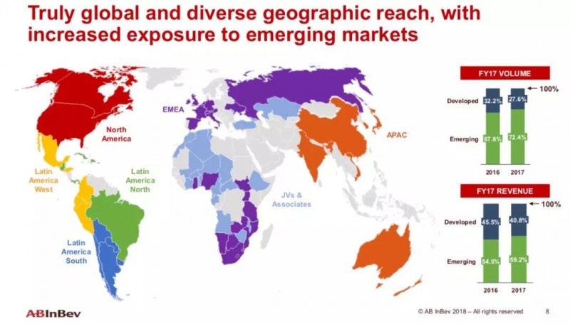 与SAB米勒的合并使新公司的全球布局更为完善,从高增长市场获得更多机会。2017年,72.4%的销量和59.2%的营收来自新兴市场。