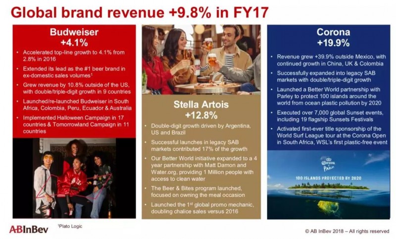 展望2018年,百威英博表示将继续实现营收和EBITDA的强劲增长。在高端化和营收管理举措的推动下,每百升营收将跑赢通胀,成本则将控制低于通胀。