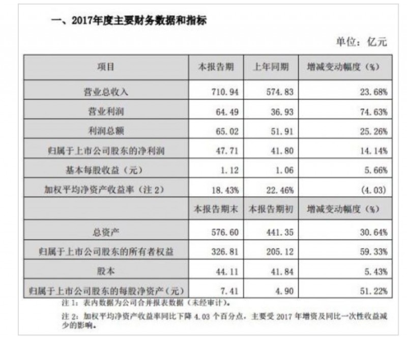 本报告期末,公司的总资产为576.60亿元,较上年同期上升30.64%;归属于上市公司股东的所有者权益为326.81亿元,较上年同期上升59.33%;归属于上市公司股东的每股净资产为7.41元,较上年同期上升51.22%,主要原因为公司2017年度净利润的增加,以及2017年非公开发行股票募集资金所致。
