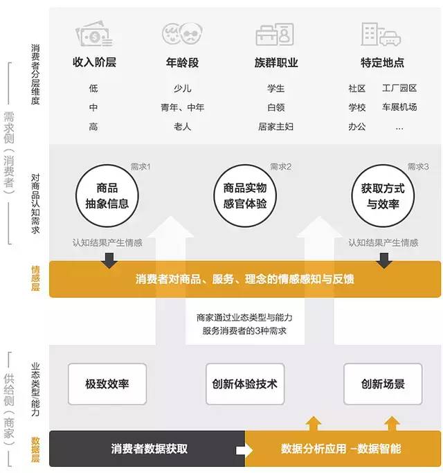 从精彩纷呈的新零售商业案例中切回到用户体验视角,分析在零售业中消费者端人们对商品的几类需求及对进行消费行为时的情态,这里将其总结为“3需1感” 3需是指消费者的3方面需求: